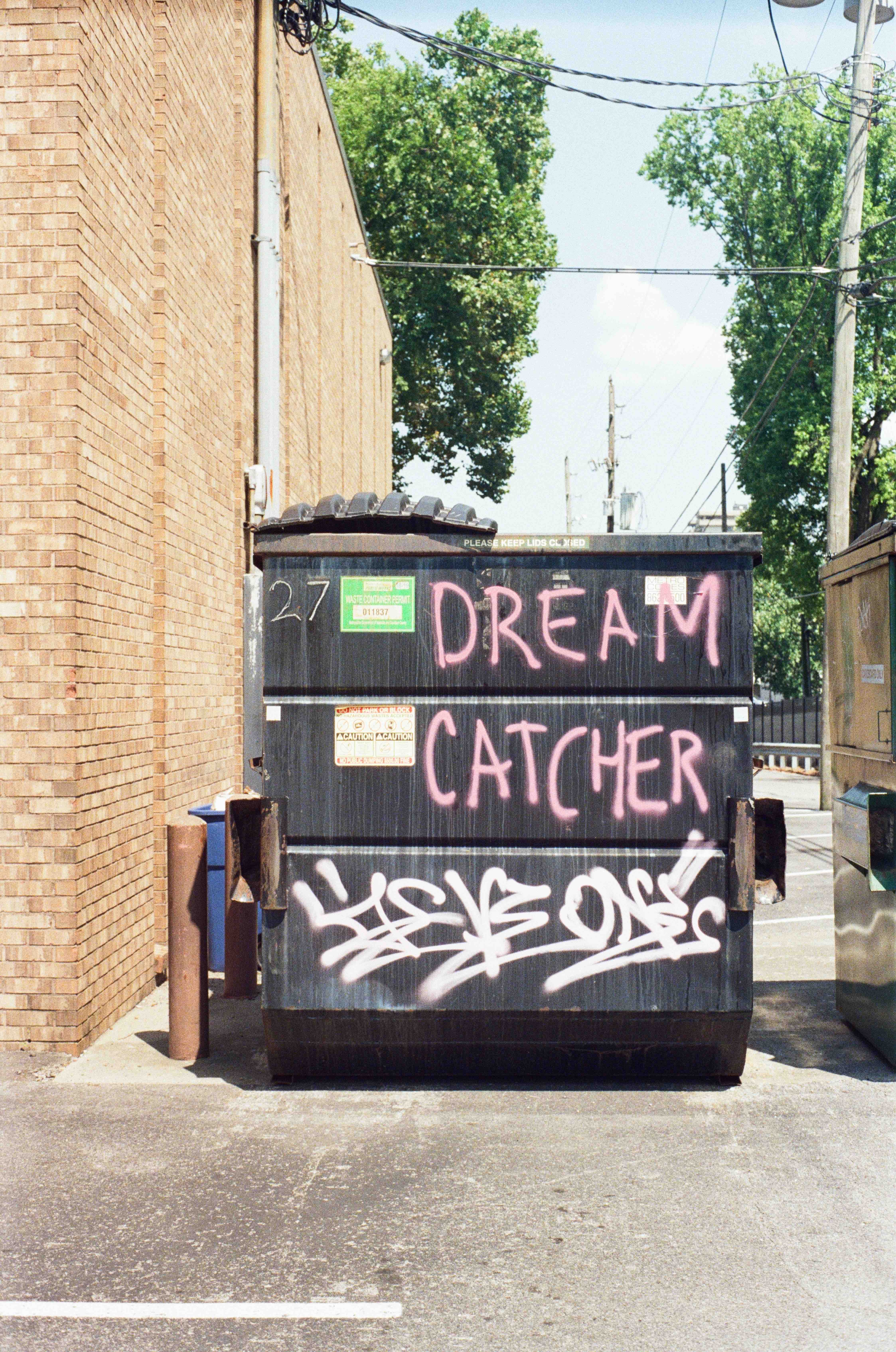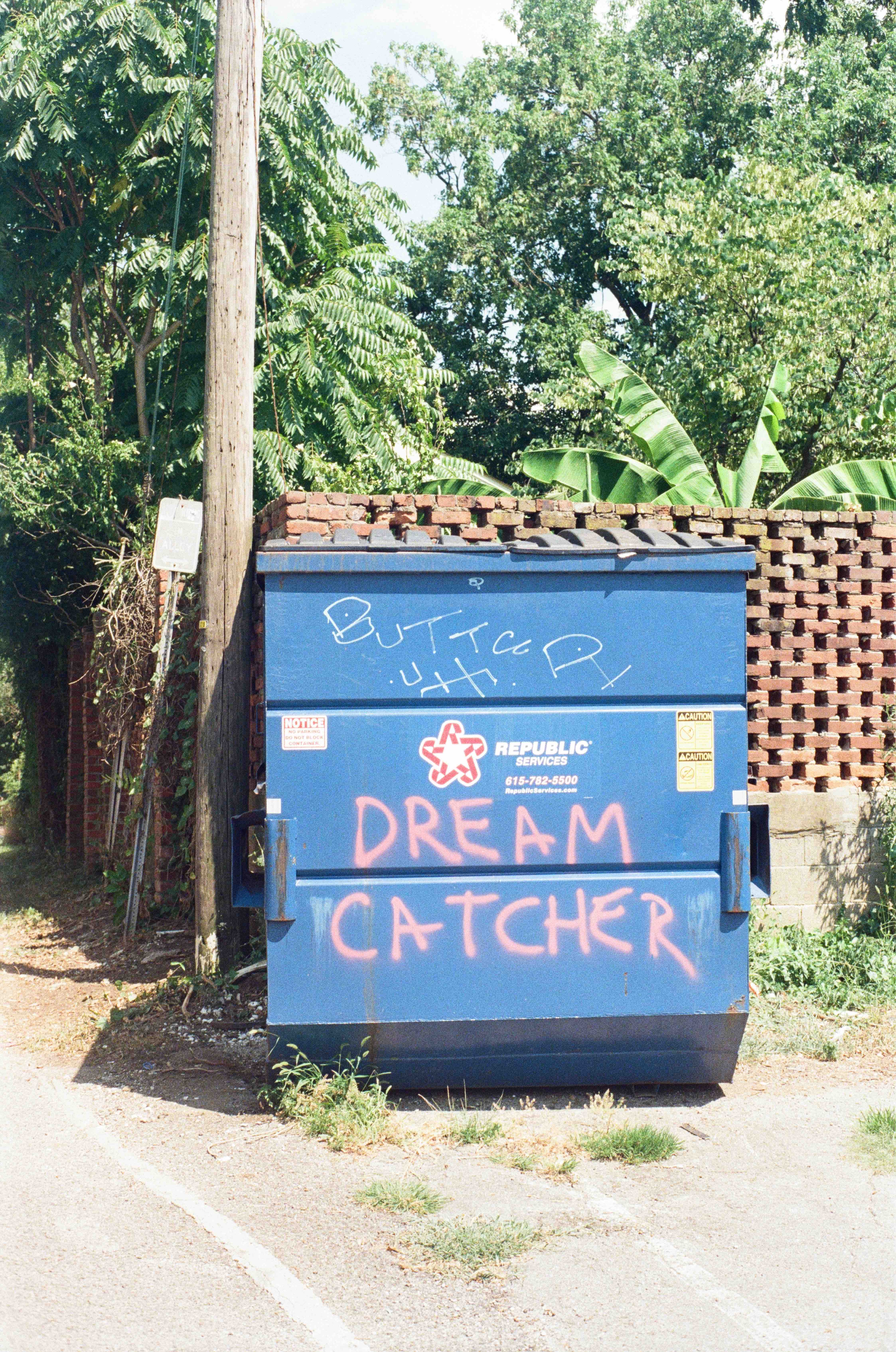 An ongoing film photography series documenting the mysterious “DREAMCATCHER” tag on dumpsters around Nashville