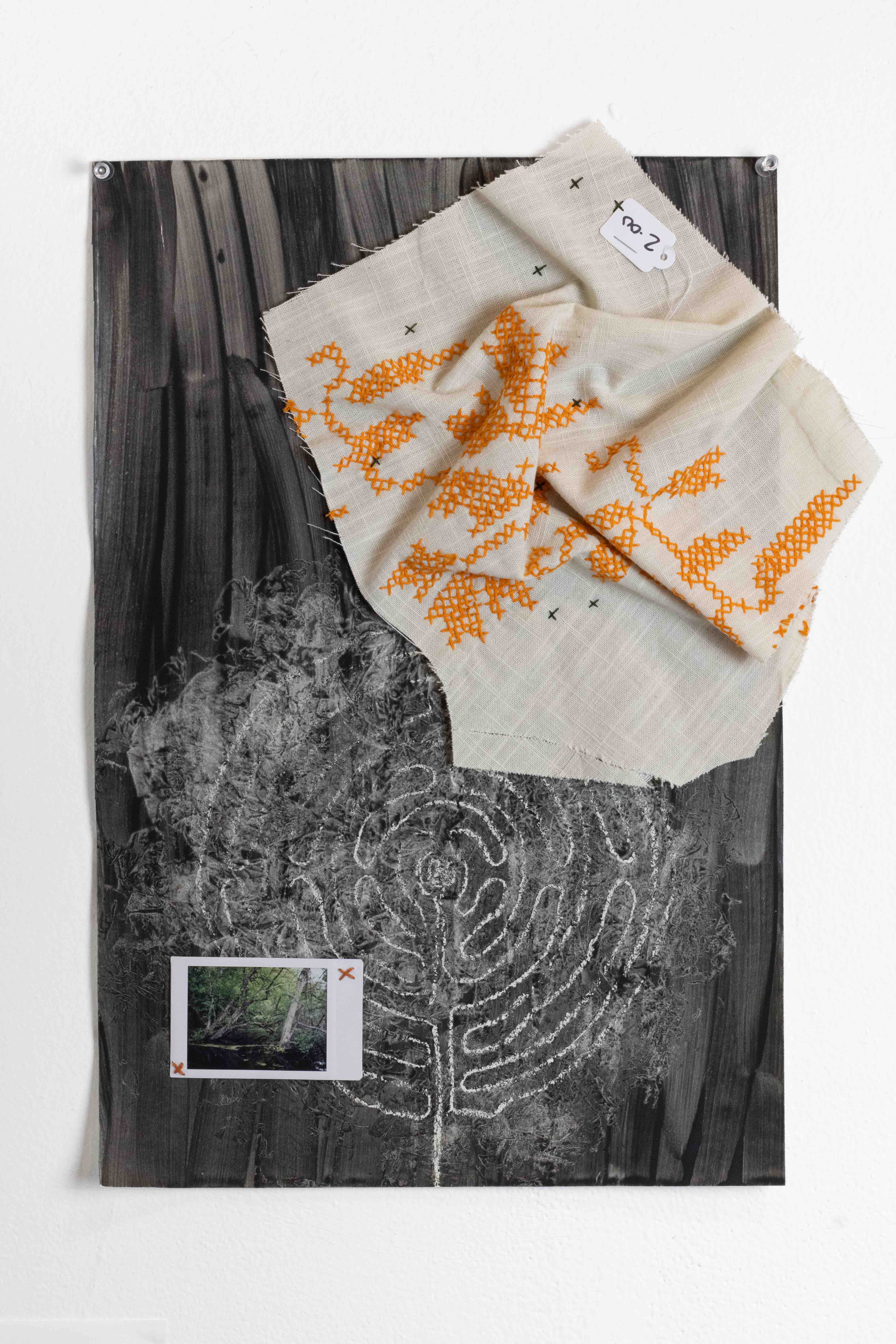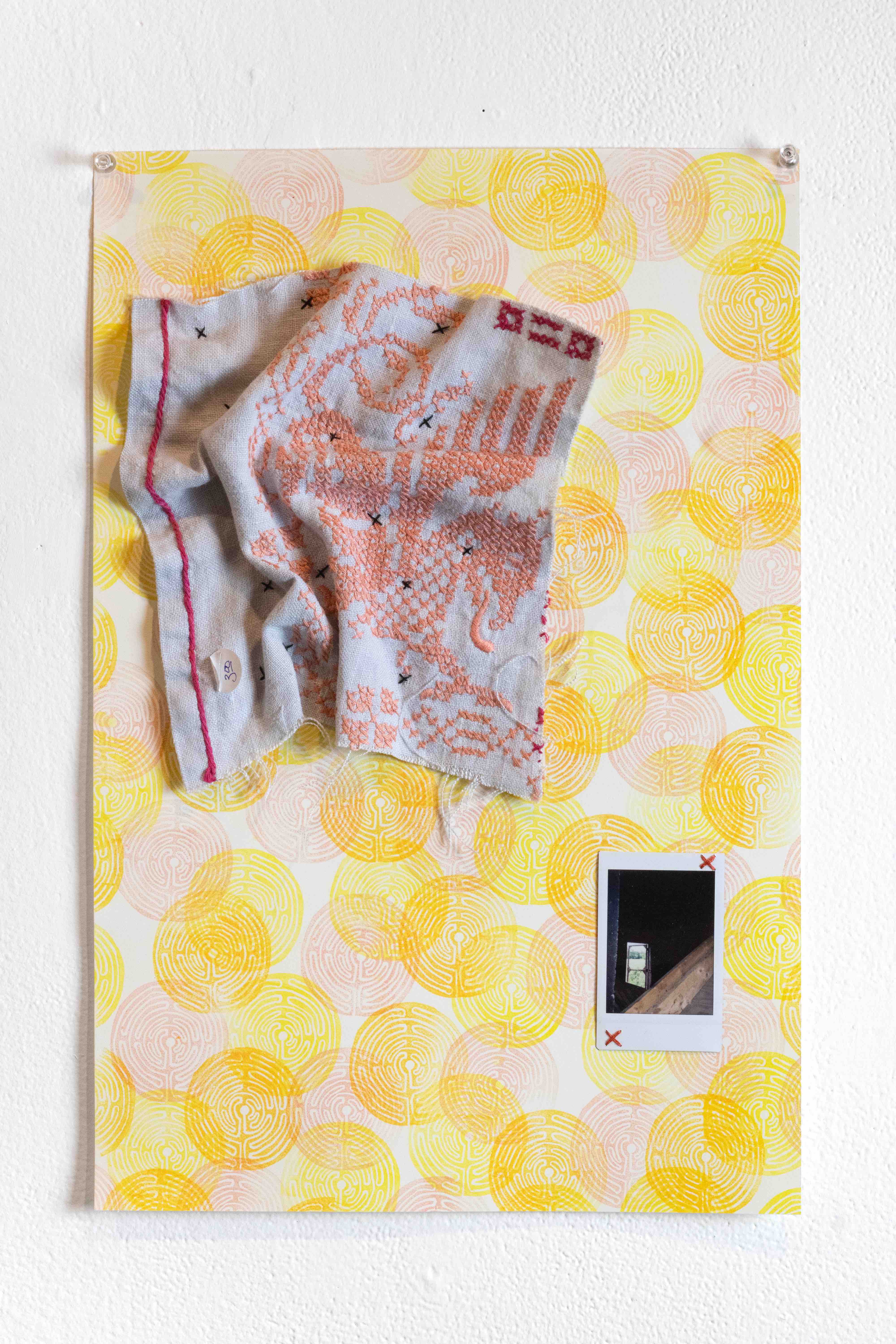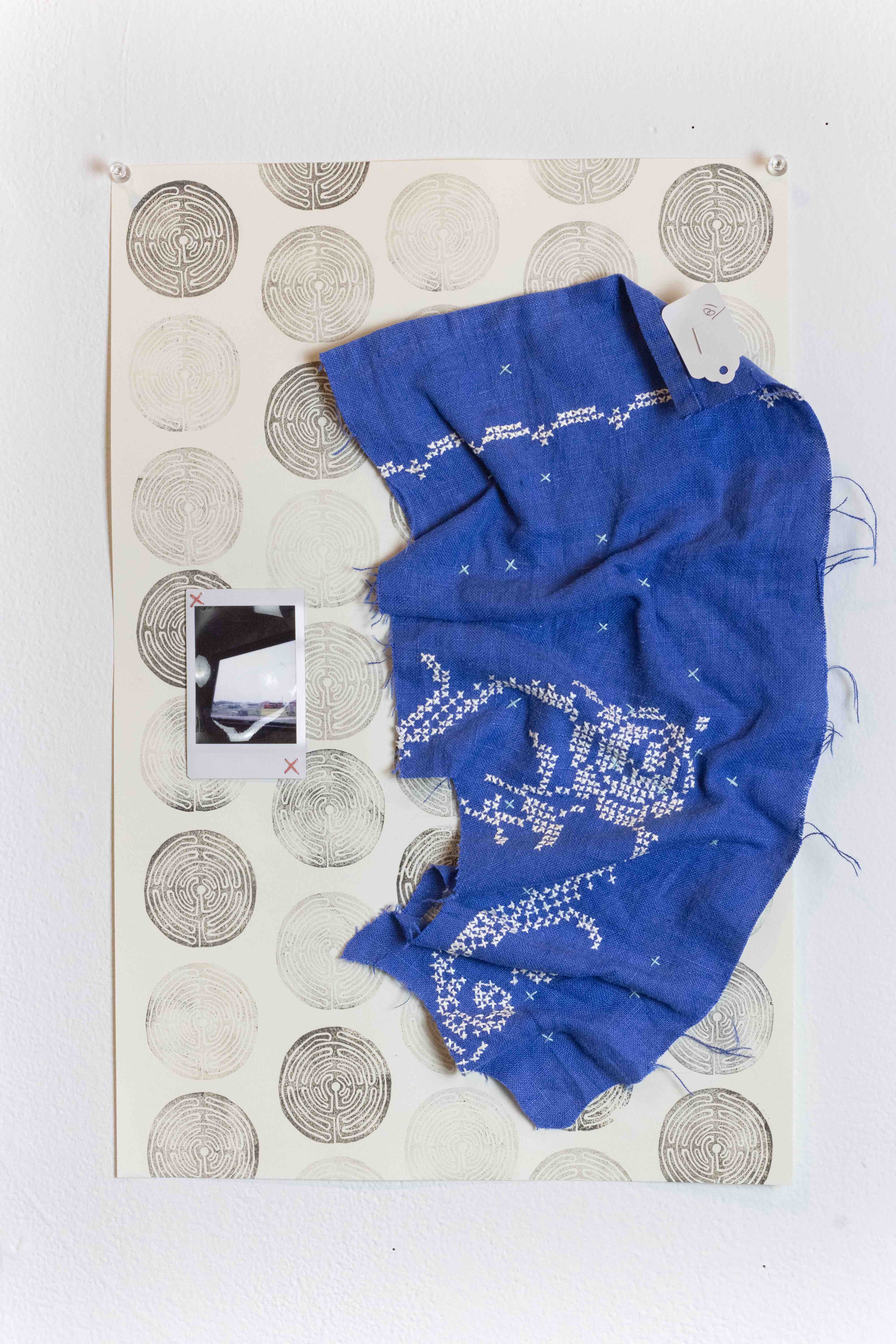 This series was inspired by a single day I spent in Paducah, Kentucky during QuiltWeek, an annual event showcasing the work of quilters around the world. Each collage combines three elements: a scrap of salvaged cross-stitched fabric that I bought from a vendor at the event, a polaroid photograph I took while walking a greenway, and the symbol of a labyrinth.